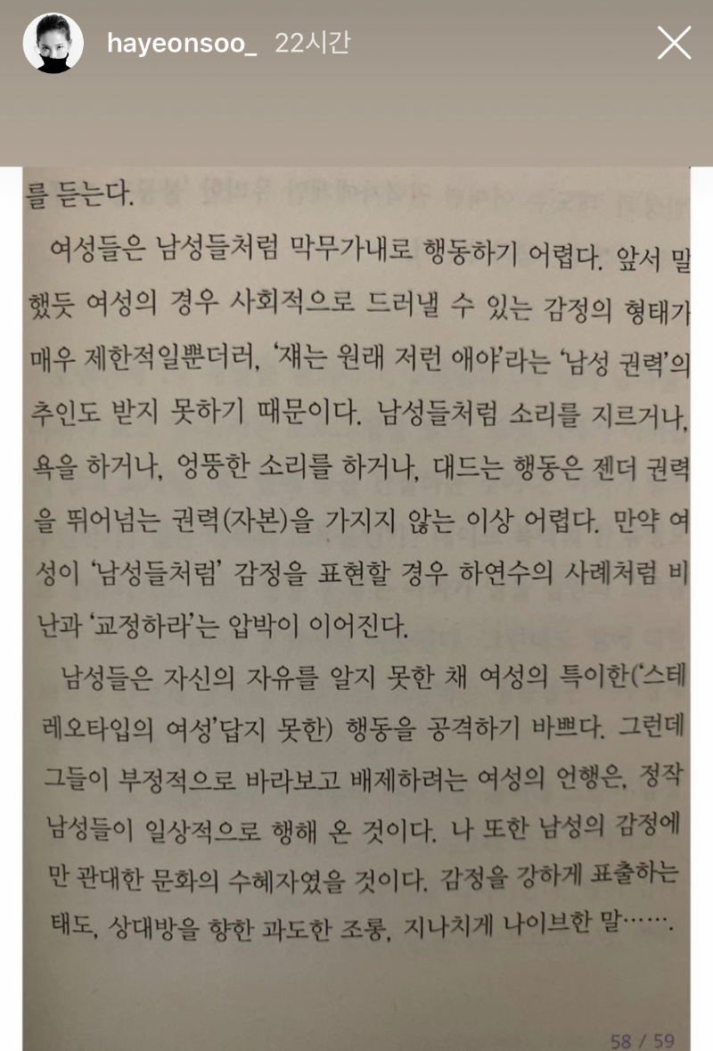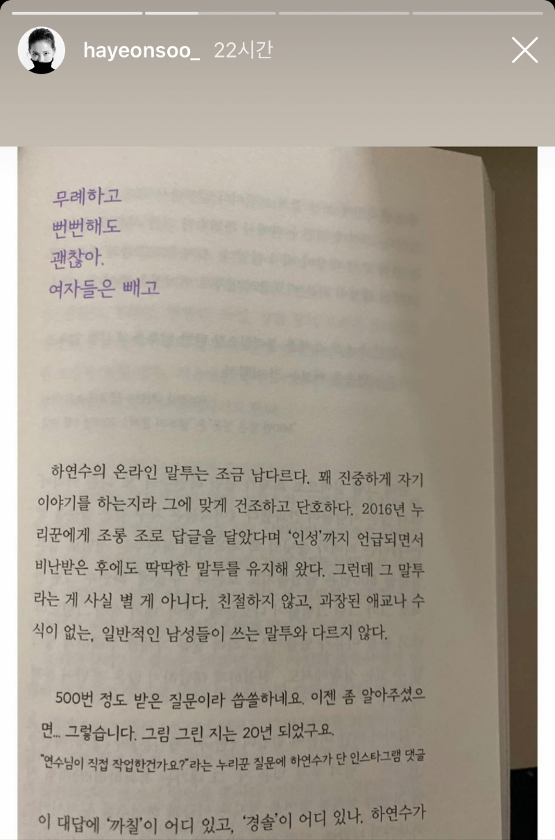 하연수는 자신의 인스타그램 스토리에 책 내용을 올렸습니다. 그 내용은 하연수의 딱딱한 온라인 말투에 대한 내용이 담겨있었으며, 이에 일반적인 남성이 쓰는 말투와 같다며 "여성들은 남성들처럼 막무가내로 행동하기 어렵다"라는 이야기를 담고 있습니다. 이러한 인스타그램 스토리 내용을 보고 일부 네티즌들은 하연수가 페미가 아니냐며 논란이 있었습니다.