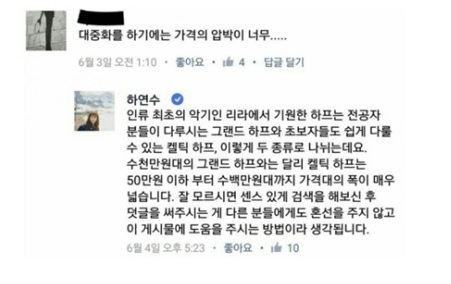 이에 많은 네티즌들이 단지 물어봤을 뿐인데 너무 까칠하게 댓글을 달아준 것이 아니냐며 하연수 인성에 대한 비판이 있었습니다. 이후 하연수는 인스타그램에 친필로 사과문을 게재하였으나 댓글을 삭제하는 모습이 포착되어 또다시 구설수에 오르기도 하였습니다.
