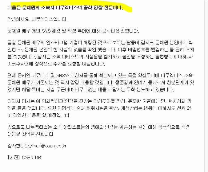 문채원은 자신의 SNS에 "인간 같지도 않은 인간들 때문에 사람 속이 문드러지고, 찣기고, 사람대접도 못 받는 경우가 있다. 그런 경우를 만드는 사회악들이 있다"라며 언급을 하였고, 이후 문채원은 바로 SNS를 삭제하였습니다.