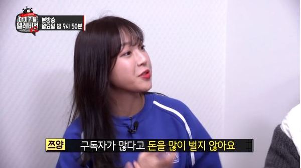 쯔양은 '마이 리틀 텔레비전'에 출연하여 월 수익에 대해서 밝혔습니다. 쯔양은 "최고 많이 벌었던 달은 한 달에 4천에서 6천, 8천만 원까지 번다"라고 언급하였으며 "그 정도면 한 달에 조회수 100만 인 것만 계속 나와야 한다"라고 발언하였습니다.