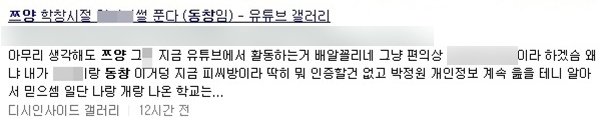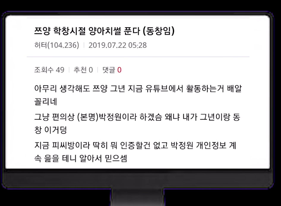 한 커뮤니티에서 쯔양의 동창이라고 주장하는 한 네티즌이 "쯔양의 학창 시절, 술이나 담배를 하고 학교도 잘 나오지 않는 학교폭력 가해자였다"고 주장을 하였습니다.