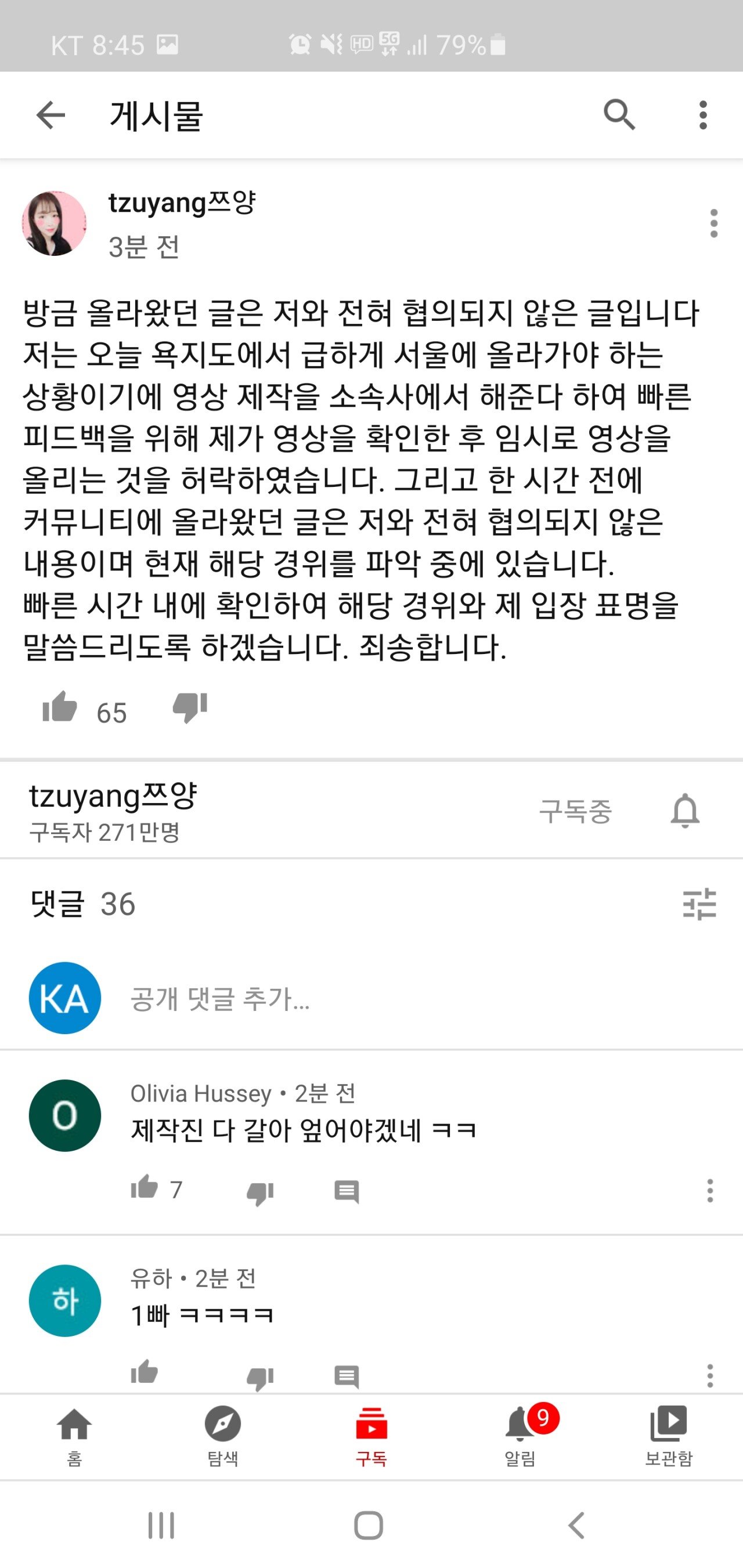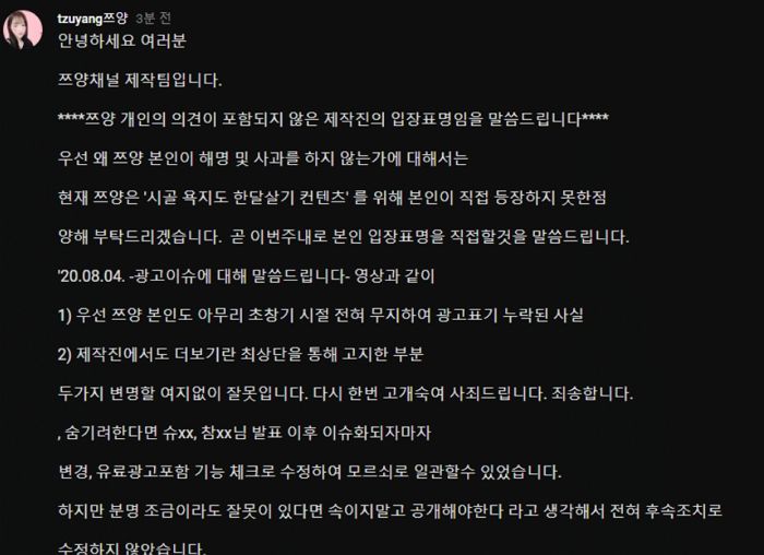 쯔양의 제작진은 이 뿐만 아니라 입장글을 올리고도 하였지만, 타 유튜버(홍사운드) 저격문이라는 논란으로 단 시간에 500개가 넘는 비판 댓글이 달렸습니다.