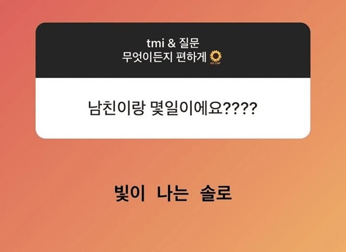 하지만 슈기는 이후에 강민석과의 결별을 암시하였는데 슈기의 인스타에서 한 일반인이 "남자 친구랑 며칠이에요?"라는 질문에 "빛이 나는 솔로"라며 대답을 해주었습니다.